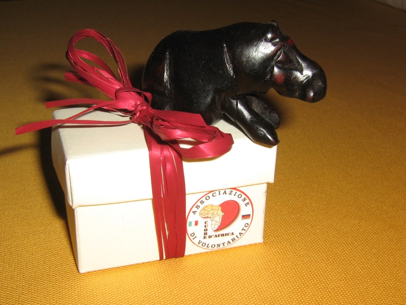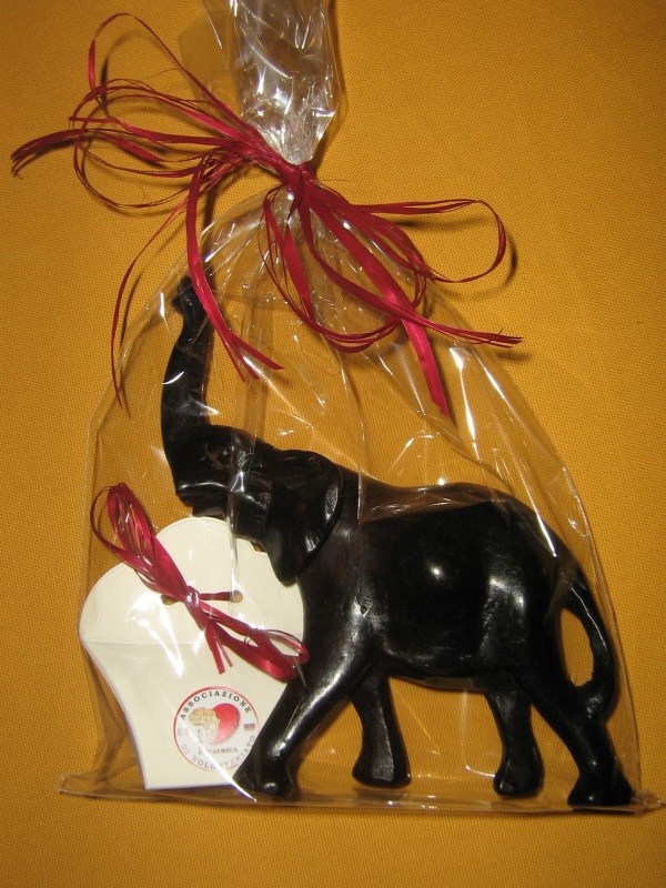 Una scatolina di cartone (il modello potrebbe variare a seconda delle disponibilità) chiusa con un nastro di raso ed accompagnata da un animale medio in ebano (soggetti assortiti fra quelli disponibili; dimensione 7-8 cm circa). La confezione trasparente è chiusa da un nastro di raso. La scatolina contiene 5 confetti ed è accompagnata da una pergamena con i dati della cerimonia. Suggeriamo un contributo minimo di € 10 al pezzo.