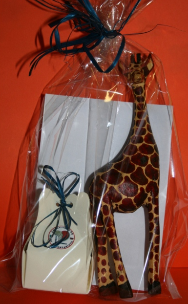 Una giraffa media (10-12 cm) in ebano giovane interamente dipinta a mano affiancata da una scatolina di cartone contenente 5 confetti (il modello potrebbe variare a seconda delle disponibilità). La scultura è confezionata in una busta trasparente chiusa con un nastro di raso. La confezione è accompagnata da una pergamena con i dati della cerimonia.