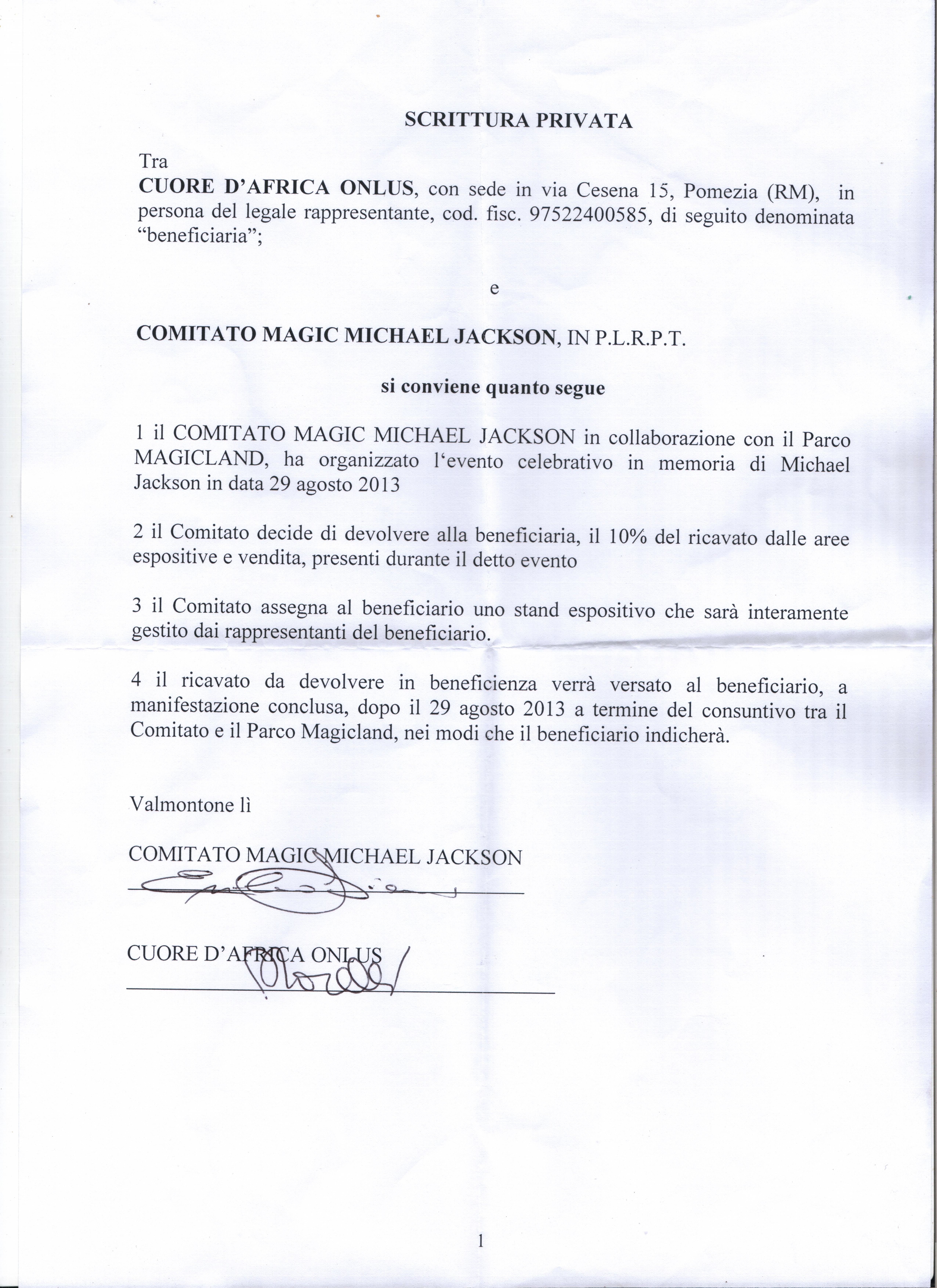 Nell’area espositiva del parco MagicLand erano presenti diversi stand che hanno effettuato vendita di oggetti a tema per tutto il giorno. Come da accordo sottoscritto con il comitato organizzativo Magic Michael 2013, era stato stabilito che il 10% dell’incasso di tutti gli stand sarebbe stato devoluto in beneficenza, ma qualche giorno dopo abbiamo ricevuto una sorprendente bella notizia: la donazione sarebbe stata maggiore!