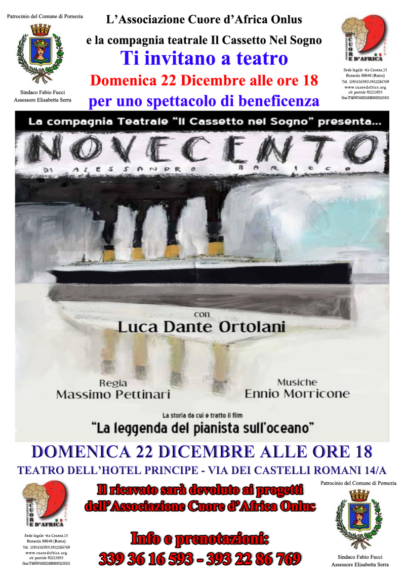 Per augurare un Buon Natale ai nostri soci, abbiamo concordato con la compagnia teatrale Il Cassetto nel Sogno un nuovo appuntamento con un nuovo spettacolo: Novecento, il monologo di Alessandro Baricco dal quale è stato tratto il film La leggenda del pianista sull’oceano. Un one man show interpretato da Luca Dante Ortolani, che ha deliziato e commosso il pubblico facendo rivivere le scene del film sotto la regia di Massimo Pettinari. Ancora una volta la compagnia si è esibita senza chiedere alcun compenso, consentendo di ottimizzare la nostra raccolta fondi. Il ricavato è stato di 270 euro, che sono stati destinati alle spese di spedizione del container di aiuti che partirà nei primi mesi del nuovo anno alla volta di Machakos. Abbiamo già provveduto ad imputarli alla relativa Buona Causa in attesa che tutto sia pronto per la partenza del container. Cogliamo l’occasione per ringraziare nuovamente tutti i soci e gli amici che sono intervenuti e che ai hanno accompagnato anche in questo importante progetto. I nostri ringraziamenti vanno ovviamente anche agli amici Massimo e Luca, che sono stati i protagonisti di questa iniziativa!